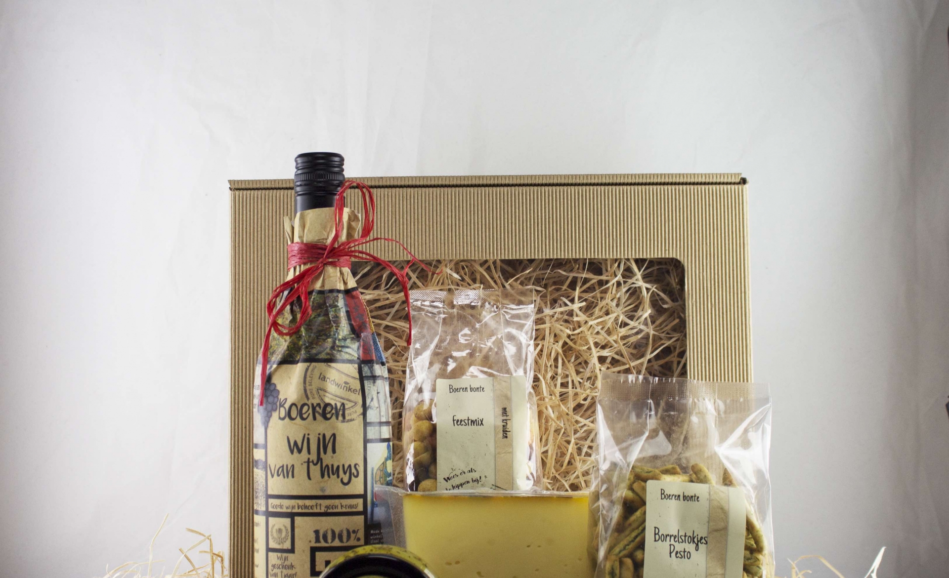 Delicatessenbox Boer Tom van onze Landwinkels kenmerkt zich door de fraaie fles kwaliteitswijn gehuld in een unieke verpakking. Drink hem met een stukje boerenkaas en worst. En heeft u onze smaakvolle ambachtelijke mosterd-dille dip al geproefd? Dat is smullen!
